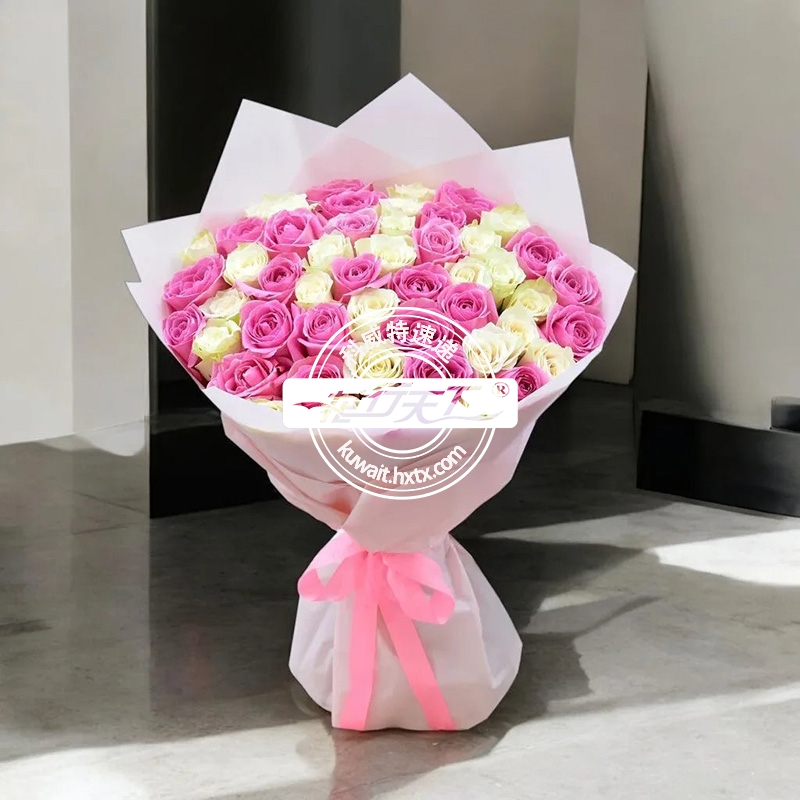 描述: 粉色与白色玫瑰50枝、精美包装。
