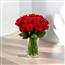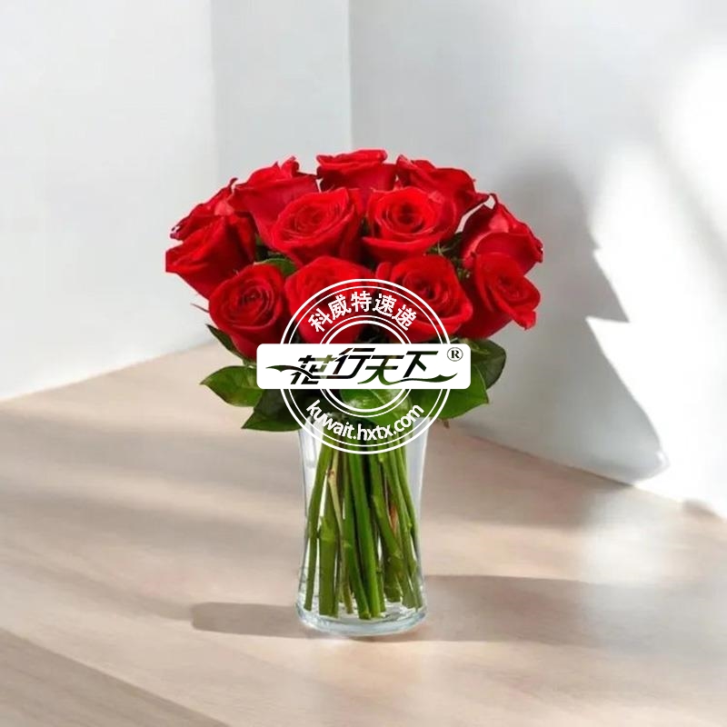 红色玫瑰18朵组成、玻璃花瓶装.