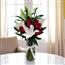 红玫瑰6朵、白百合4枝和绿叶组成、玻璃花瓶装.